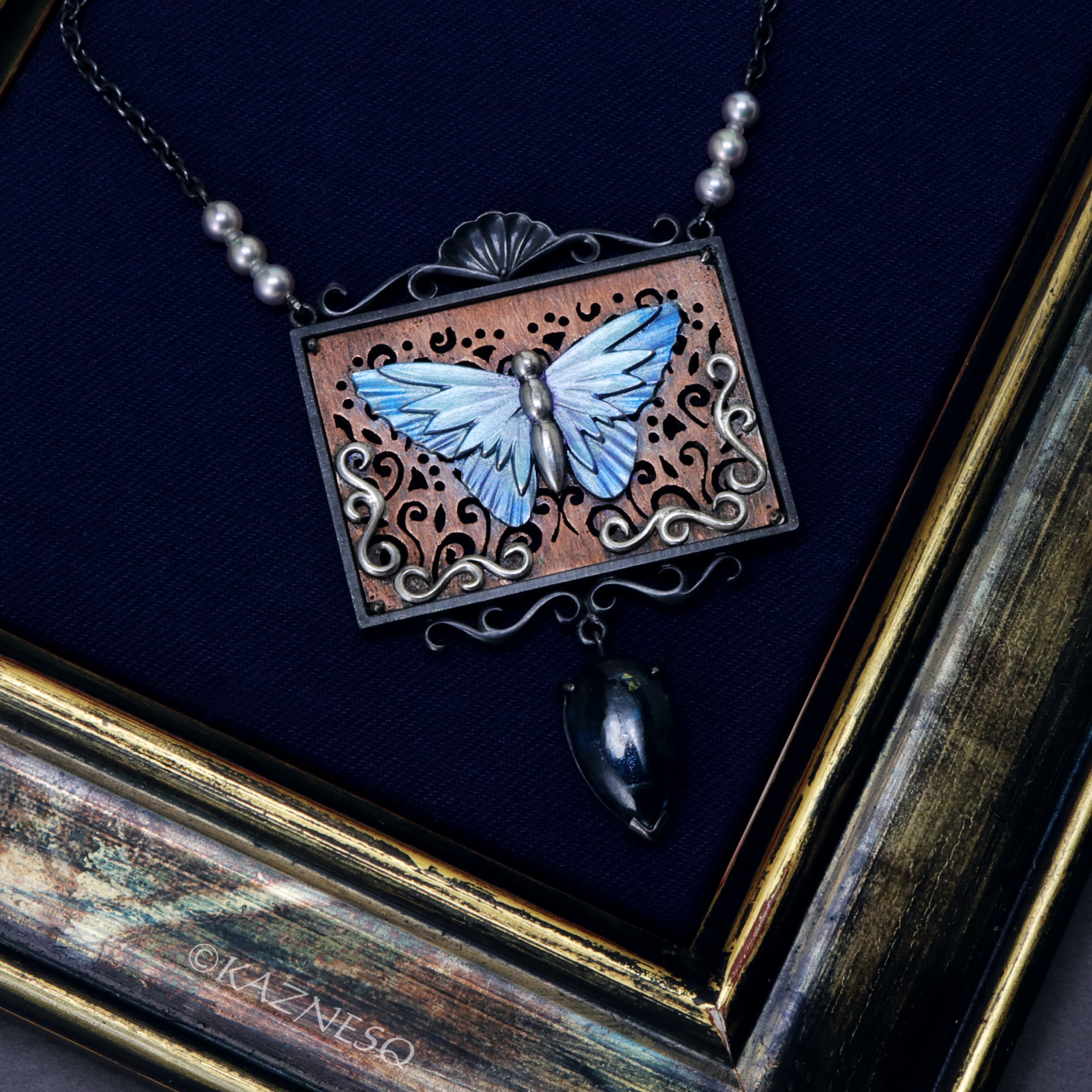 The main motif is a blue butterfly, possibly a Morpho butterfly.