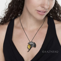 The stone is a irregular facetted citrine lined with mother of pearl.