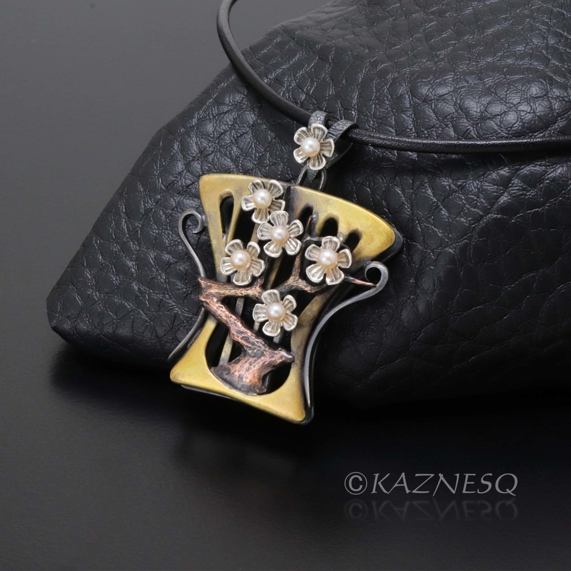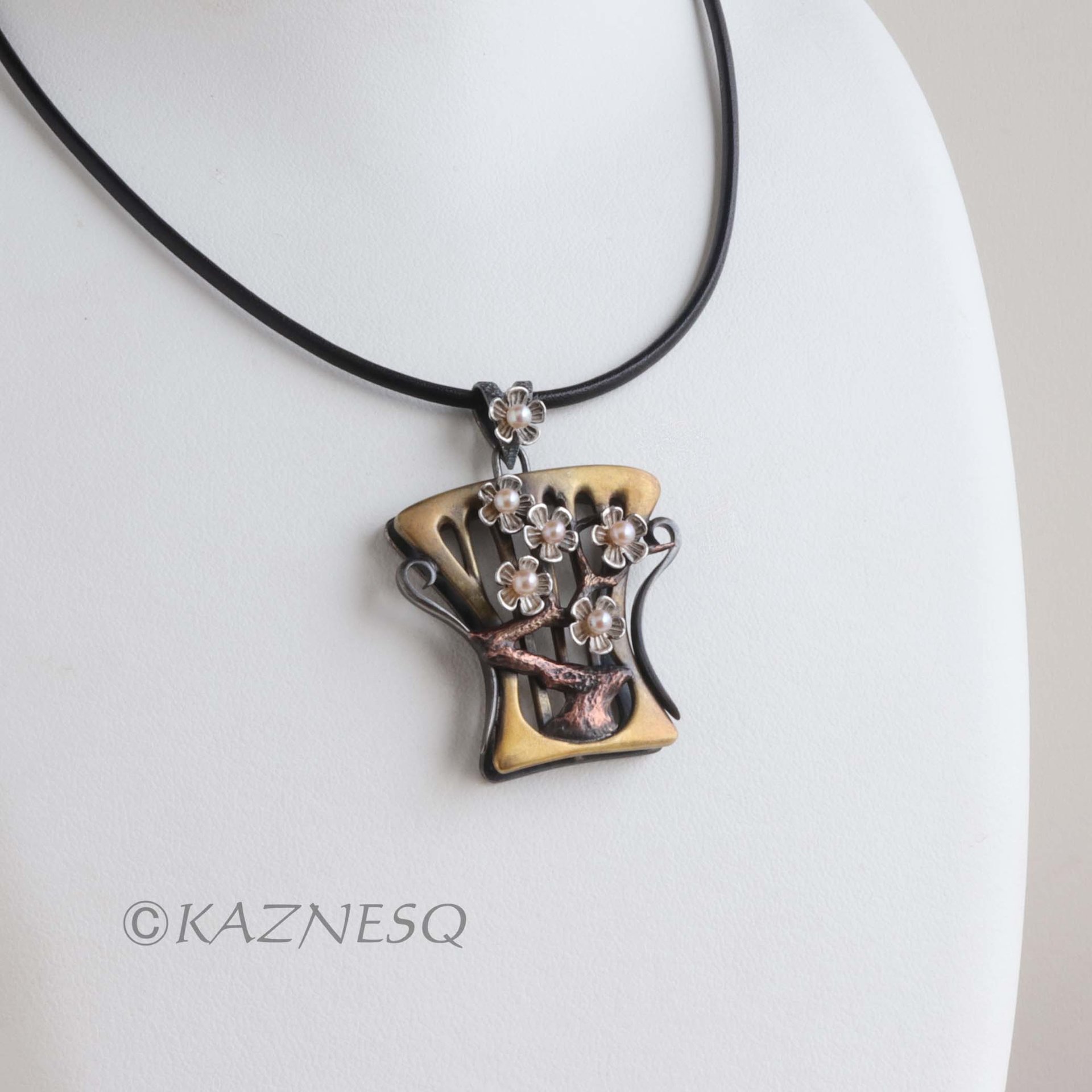 Art Nouveau style white plum blossoms pendant of oxidized silver and brass