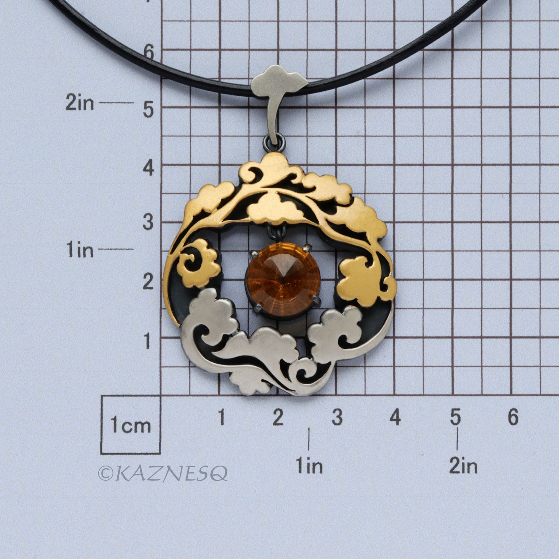 The pattern is called "Cloud of Fortune" or "Happy Cloud," a traditional Asian design. I expressed it using a technique called Keum Boo, a form of gold gilding. The surface has a matte finish, allowing the combination of gold and silver to be seen clearly. The center stone is a citrine with a unique cut, giving the impression that light spreads in all directions with concentric circles.