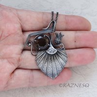 A necklace, perfect for those drawn to the allure of "Darkness". Embrace your Gothic style with this unique piece, showcasing a substantial leaf and a small spiky bud. The meticulously textured leaf reveals veins resembling ribs, and a closer look at the foot unveils an intricately engraved scroll pattern. Another focal point is a mesmerizing smoky quartz gemstone that enhances the overall sense of mystery and darkness. Each detail is expertly crafted by the hands of an artist(me), making this necklace a truly one-of-a-kind accessory.
