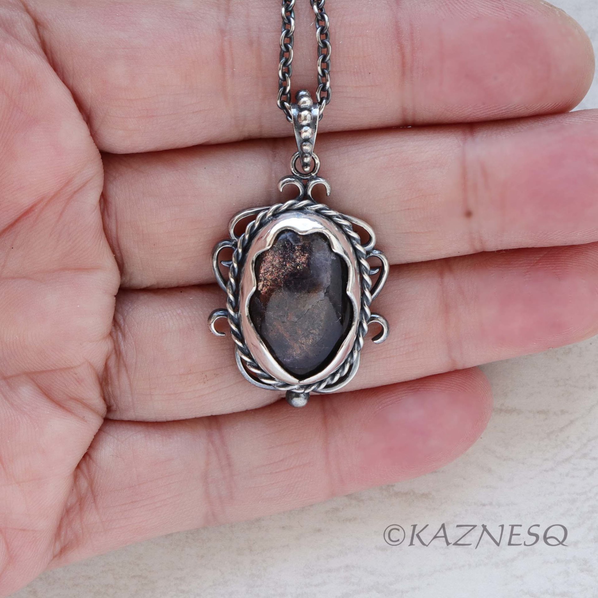 The gemstone is an Iolite Sunstone, a stunning fusion of iolite and sunstone. The predominant hue is a rich brown, with sunstone taking the lead. It shows captivating sparkles that dance gracefully with the play of light and angles. I set it within an oxidized sterling silver frame adorned with intricate filigree and scrolls, this necklace is a perfect accessory to elevate your fashion, seamlessly complementing both casual and special occasions.