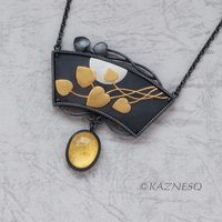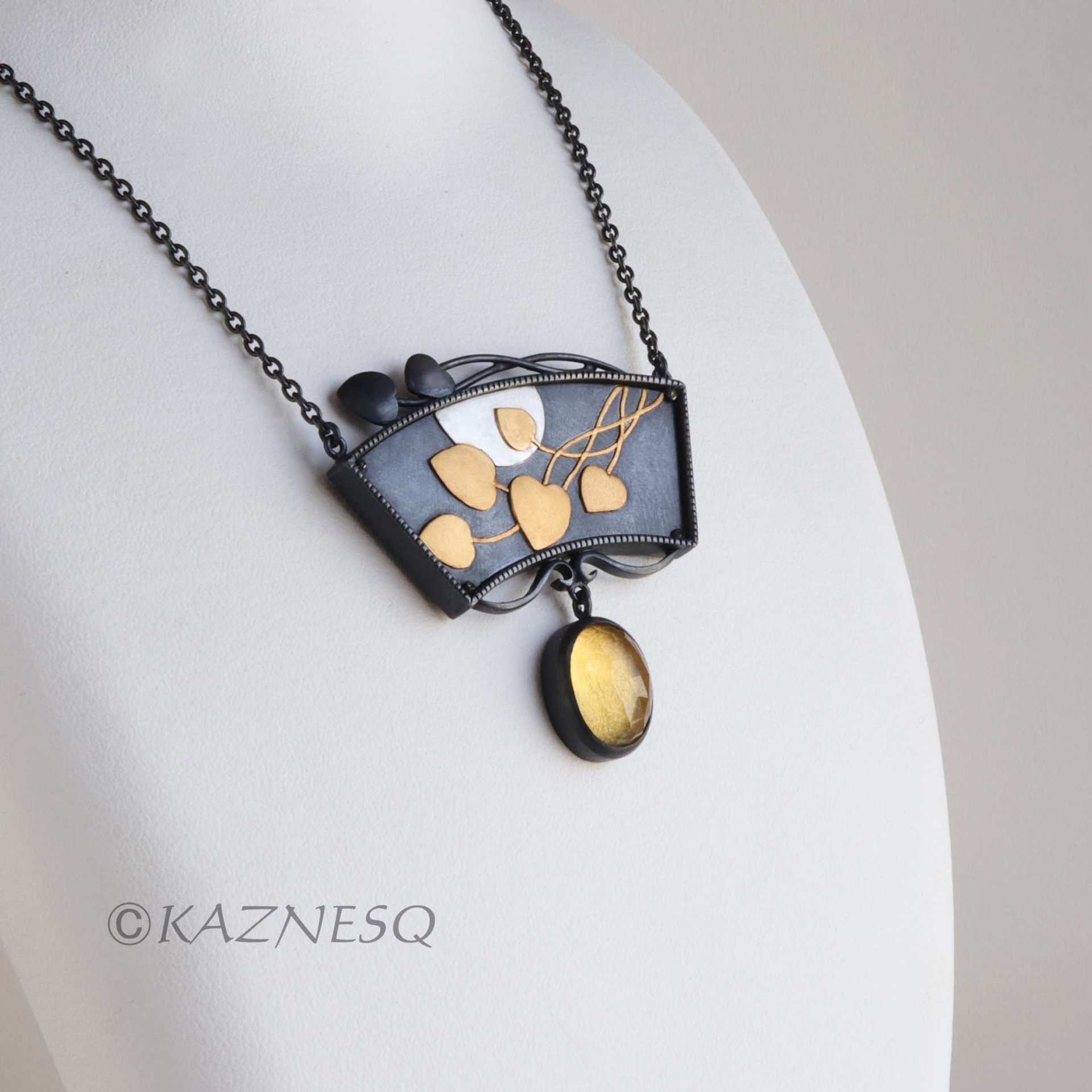 This is a pendant necklace made of oxidized silver, featuring a unique and innovative design that incorporates Japanese-style motifs into jewelry. Using the technique of "Keum Boo," the pendant showcases a beautifully detailed depiction of a moon and leaves. The stone in the pendant is a yellow quartz, lined with a gold foil to create a stunning and distinct shine.