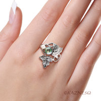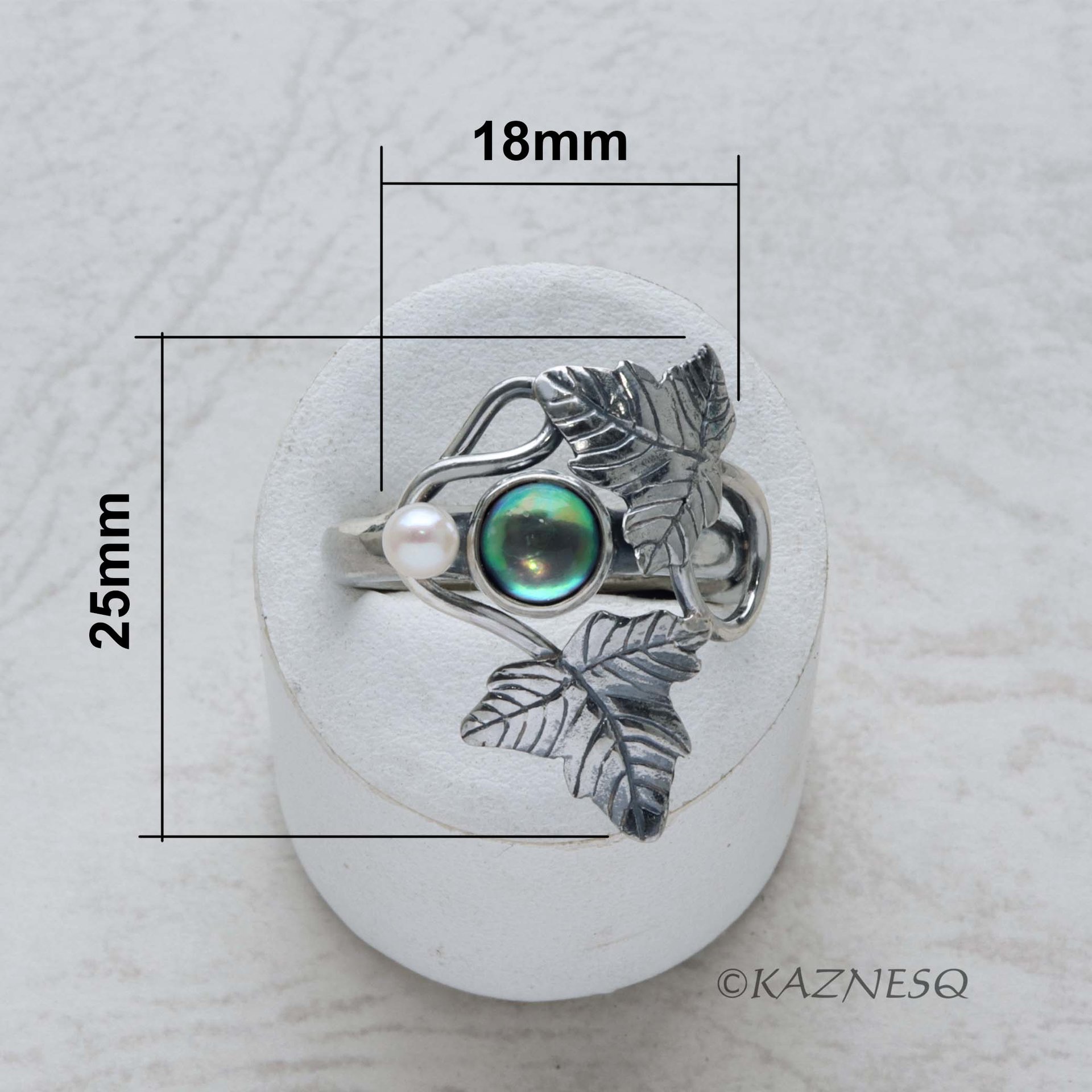 The main stone is a quartz cab lined with Paua shell. Because of the lens effect of the quartz, the Paua shell shows amazing iridescence. You can enjoy it's dance moving your finger.