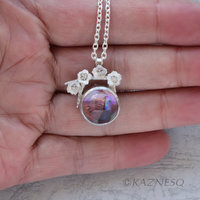 It shows mysterious iridescent mixed with faint purple of the amethyst.