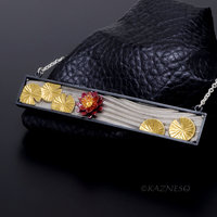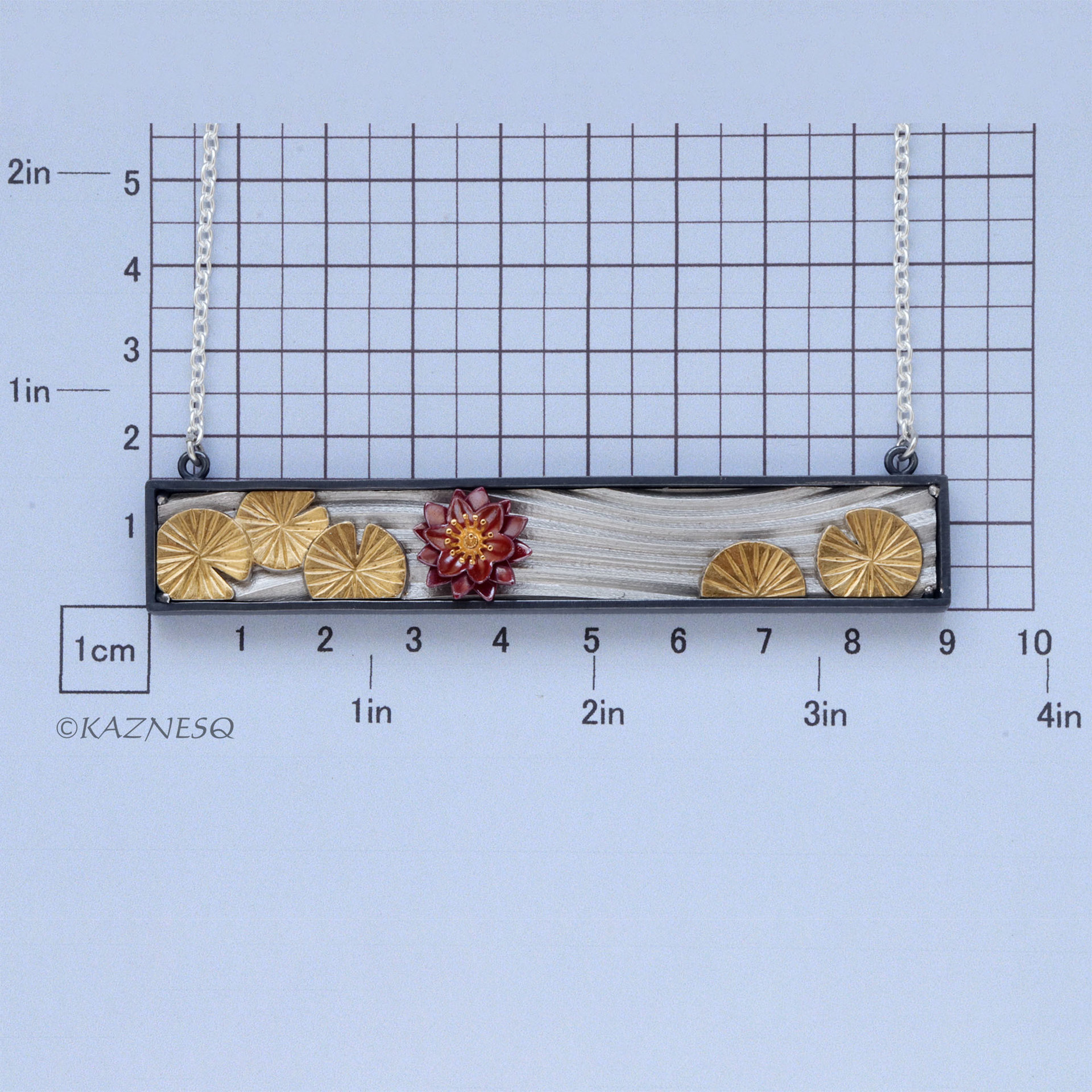 This necklace features a water lily scene captured in a sleek horizontal rectangle pendant.